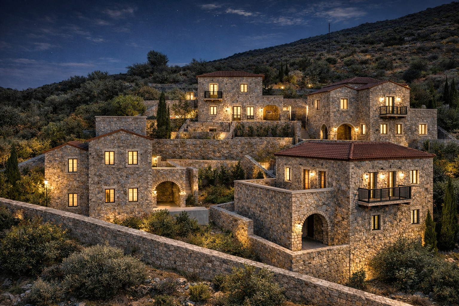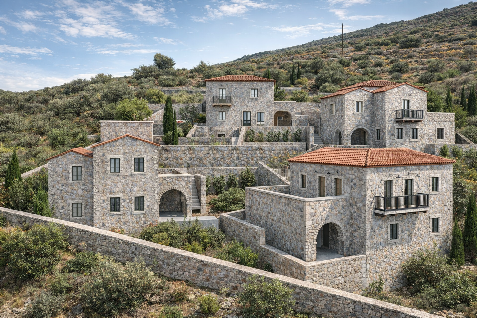 The project is formed by a stunning architectural complex of four stone buildings, crafted with traditional Maniot stone masonry and terracotta-tiled roofs. Designed across multiple levels with terraces, staircases, balconies, and arched entryways, the complex blends seamlessly into the lush hillside, reflecting the historic and cultural essence of the region. Carefully integrated greenery and outdoor spaces enhance the sense of privacy, serenity, and harmony with the natural landscape.